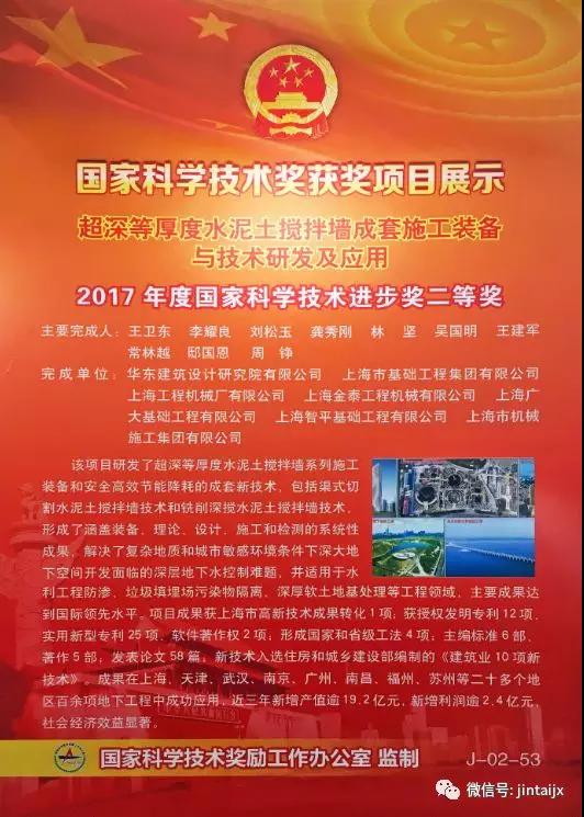 上海金泰参与“超深等厚度水泥土搅拌墙成套施工装备与技术研发及应用”项目荣获国家科技进步奖二等奖