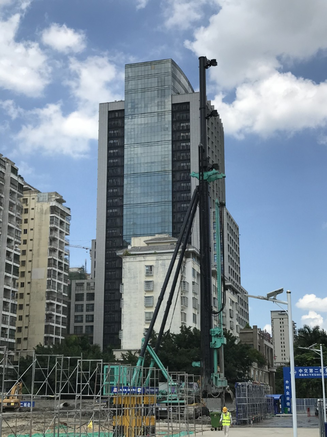 经现场项目部经理描述,该工程共有支护桩314根,止水桩191根,立柱桩151根。最大施工难点在于地下26米至30米区域间存在大量砾石夹沙层,该地层若采用传统SMW功法以及TRD功法将无法满足工程进度。经国基(海南)基础建设集团有限公司美兰区下洋瓦灶片区C0506-1地块项目部综合评估,决定采用上海金泰SC45双轮搅拌钻机“等厚水泥土搅拌墙”新技术,以确保工程效率和质量。